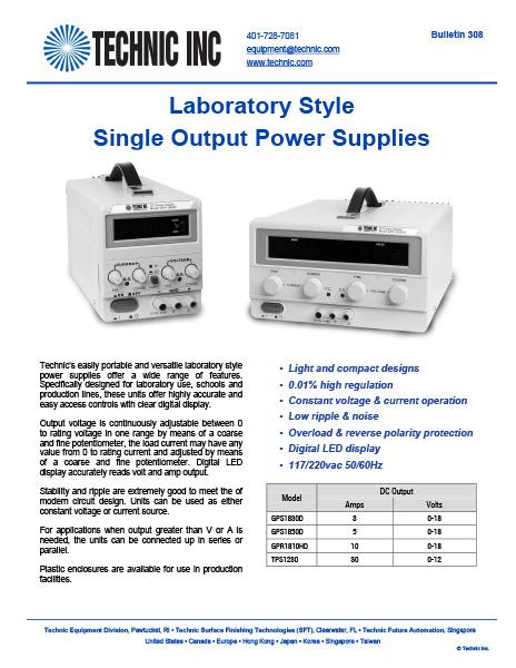 Technic offers a variety of rectifiers for plating applications including general purpose bench model rectifiers, laboratory style single output power supplies, and the CHAMP Sealed Power Supply series.